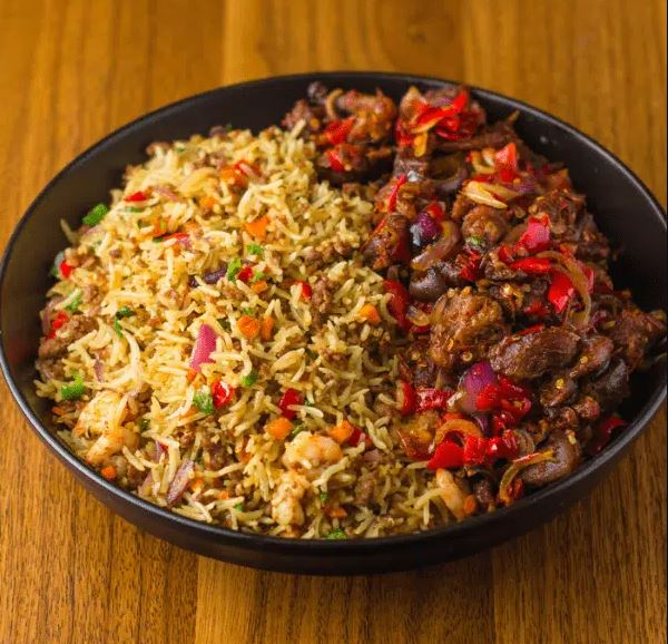 Asun rice is a popular and flavorful Nigerian dish that combines seasoned rice with spicy, grilled or roasted goat meat, known as asun